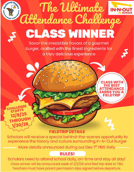 The 4th-6th Grade Class with the highest attendance will earn a field trip to In-N-Out Burger.