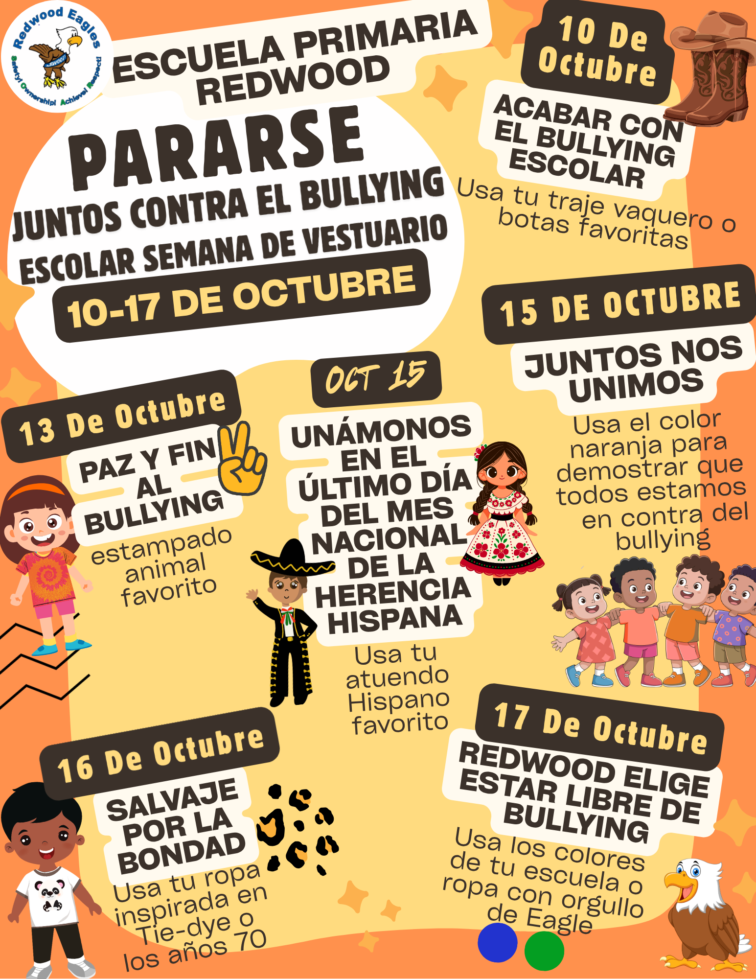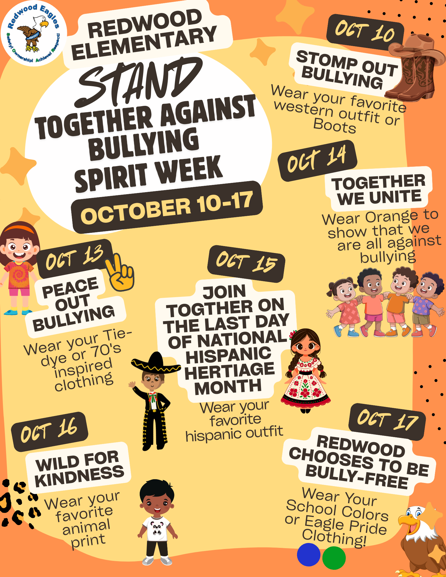Redwood Elementary STAND Together Against Bullying Spirit Week October 10-17 Published October 9, 2025 Print